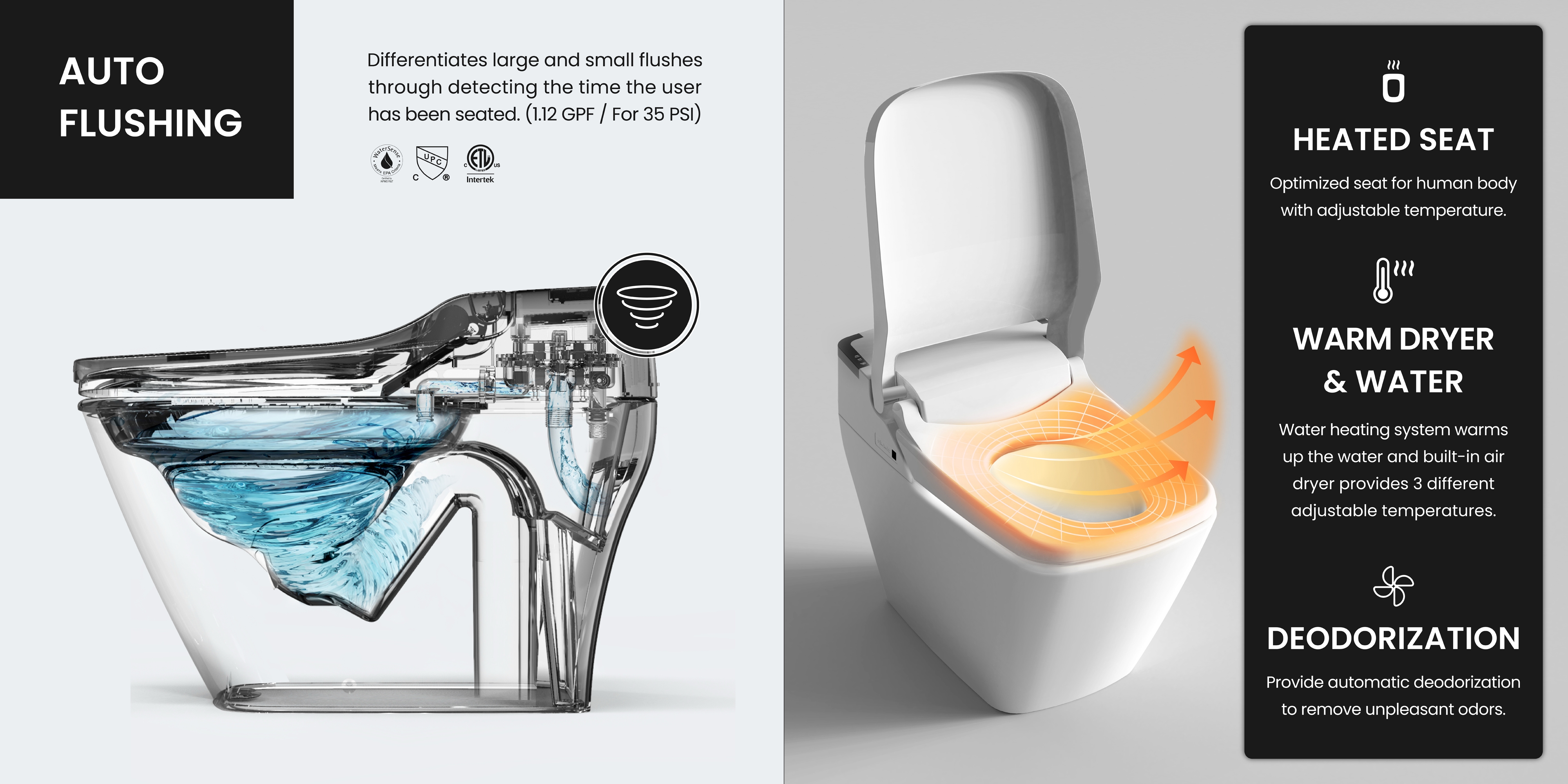 Akıllı tuvalet, otomatik açılıp kapanan kapak, ısıtmalı oturma yeri, kendi kendini temizleyen taharet musluğu ve sıcak hava kurutucu gibi beklenen kolaylıklarla donatılmış. Neo ayrıca, kişinin tuvalette oturduğu süreyi algılayarak her sifon çekişinde kullanılacak su miktarını da otomatik olarak ayarlıyor. Tuvalet, havaya yayılan kötü kokuyu da otomatik olarak gideriyor.