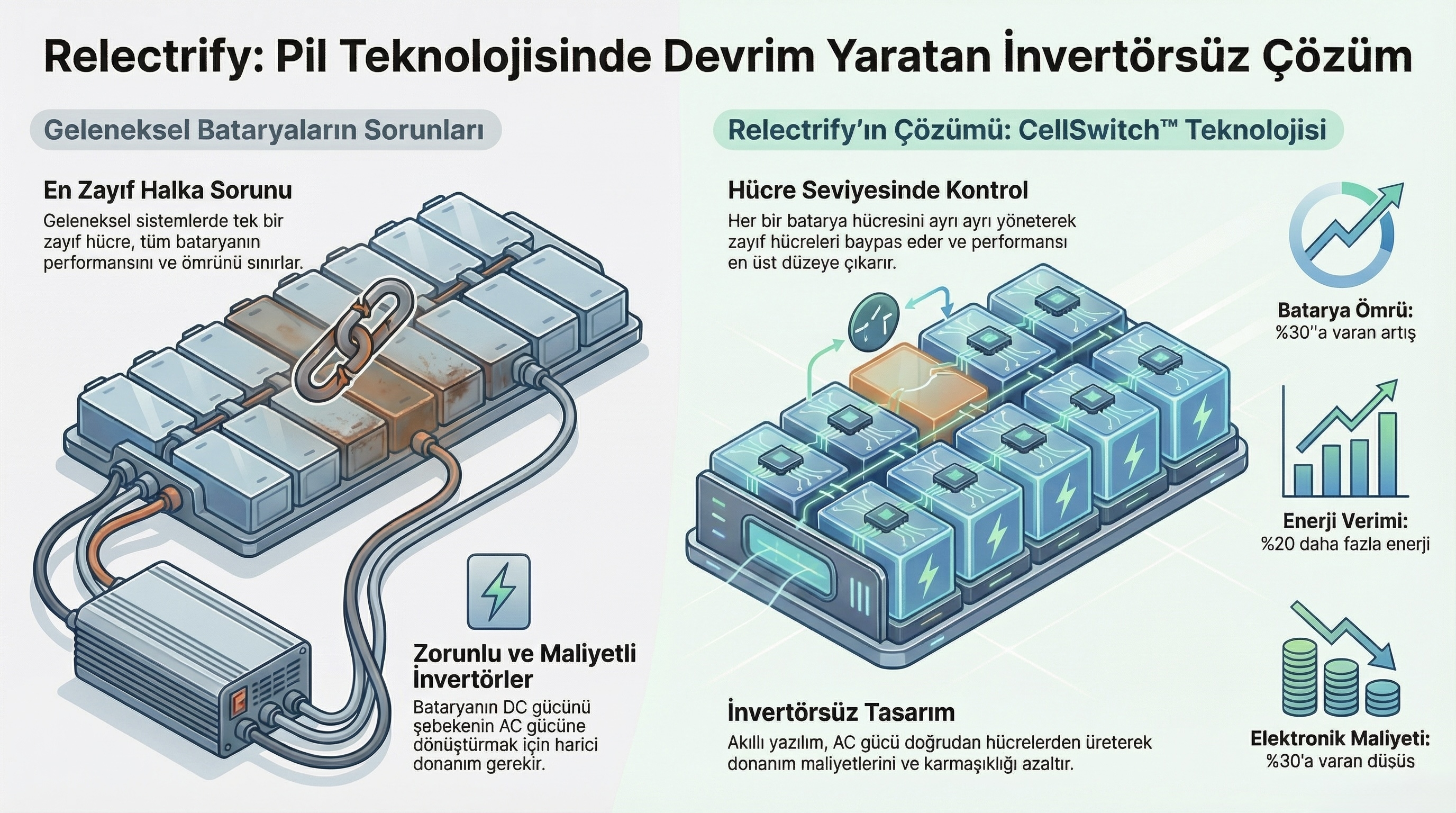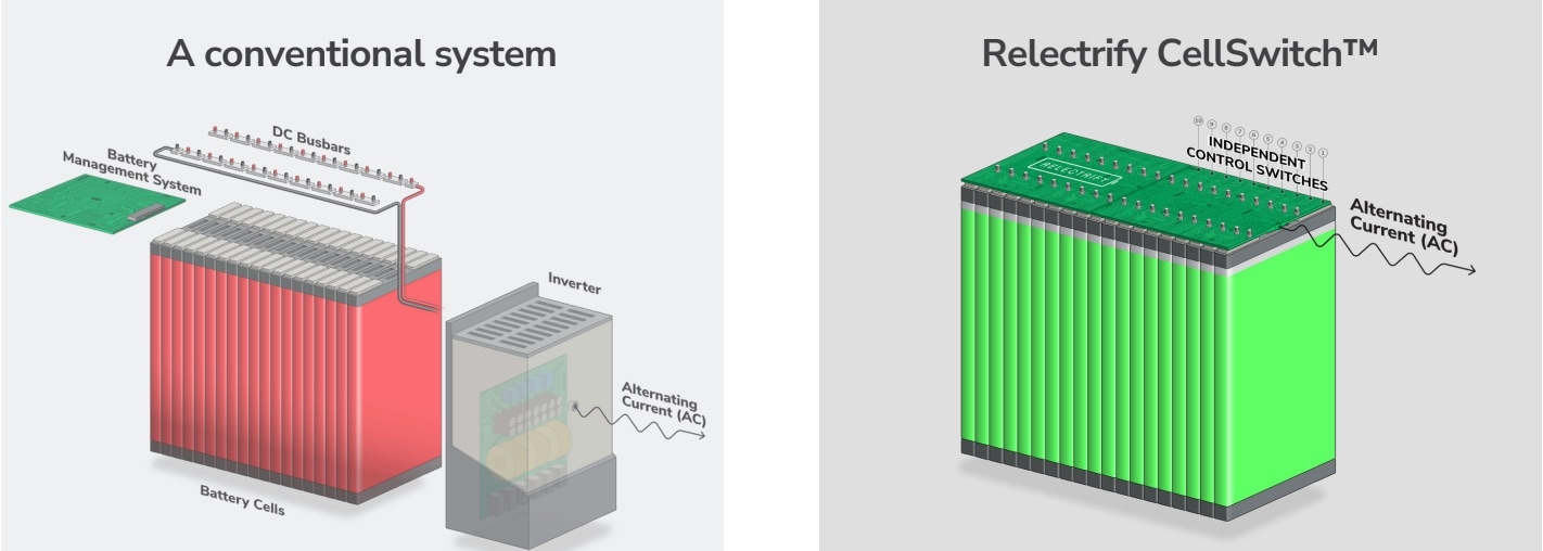 Fakat bir bataryanın jeneratörün yerine alması için ucuzlaması ve ömrünün uzaması gerekiyor. Kimyasal gelişmeler pillerdeki ucuzlamanın önemli kısmını oluştururken Relectrify farklı bir yöntemle maliyeti düşürüyor. Bunun için bataryadaki her bir hücreyi ayrı kontrol eden PCB tabanlı bir mimari geliştirdi. Avustralyalı firma bu yönetim şekli ile invertör gereksinimi olmadan alternatif akım üretmeyi başarıyor. Böylece dünyanın ilk invertör gerektirmeyen bataryası geliştirildi. Şirket, başlangıçta Nissan Leaf araçlardan çıkan eskimiş bataryaları yeniden kullanmak için kurulmuş. Öncelikle eskiyen pillerdeki hücrelerin şarj kapasitesini ve sağlığını kontrol etmeye odaklanılmış. Zira eskiyen bataryalardaki her bir hücre birbirinden farklı davranabiliyor. Bazısı erken yaşlanıyor, bazısı erken arıza veriyor. Şirket, tüm bunları takip etmek için bir pil demetini kontrol etmek yerine her pili kontrol edecek baskılı devre kartları (PCB) kullanmaya karar vermiş ve bu kartlarlada her bir pili farklı yönlerde açıp kapayarak bir alternatif akımın sinüs eğrisini oluşturabileceğini fark etmiş ve bu yönde ilerlemeye karar vermiş. Bu teknolojiye ise CellSwitch adını koymuş.