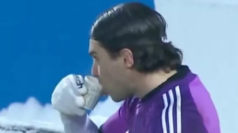 Erzurumspor FK’nın kalecisi Matija Orbanic, soğuktan korunmak adına kalesinin yanına bıraktığı çayı maçın oynandığı sırada içti.