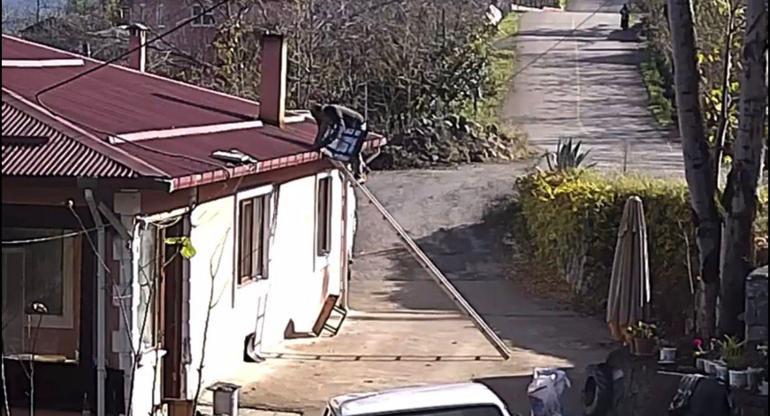 Ordu’nun Ulubey ilçesinde evinin baca şapkasını değiştirmek için merdivenle çıktığı çatıdan düşen muhtar Atıf Güngör’ün (58), sol dirseği kırıldı. O anlar, çevredeki bir evin güvenlik kamerasına yansıdı.