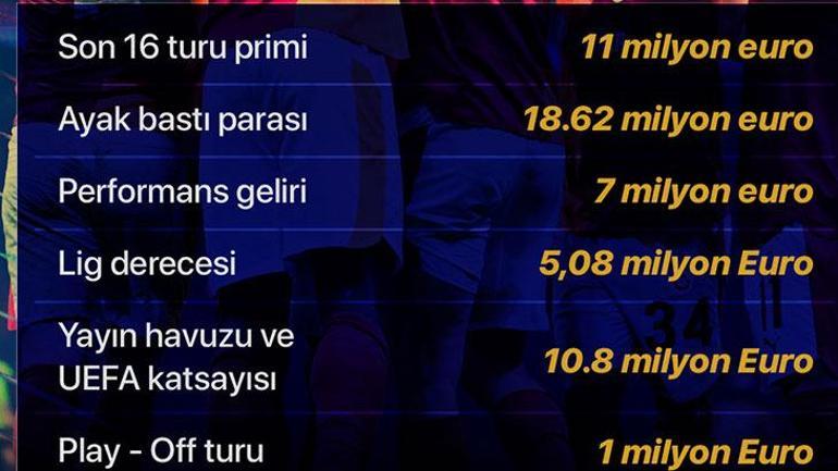 Lig aşamasına direkt kalabildiği için 18.62 milyon Euro almaya hak kazanan sarı- kırmızılı takım 3 galibiyet için 6.3 milyon Euro, 1 beraberlik için 700 bin Euro, play-off turu için de 1 milyon Euro kazandı. Lig derecesinden 5.08 milyon Euro kazanan sarı-kırmızılı ekip, yayın havuzundan da 10.8 milyon Euro kazanmıştı. Galatasaray, Juventus’u da elemesinin ardından da 11 milyon Euro daha kazandı.