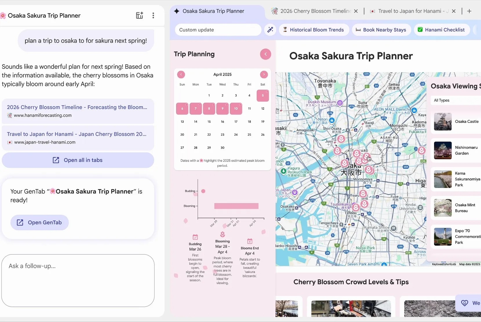 Bu çift yönlü etkileşim, konseptin merkezinde yer alıyor. GenTab öneriler sunuyor ancak kullanıcının kendi açtığı siteleri de dikkate alıyor. Yani modelden sürekli yeni şeyler üretmesini beklemek yerine, kullanıcı kendi araştırmasını da sürece katıyor. Japonya’da gidilecek yerleri sekmeler halinde açınca, GenTab bunları hem plana ekliyor hem de kendi önerileriyle birleştiriyor.