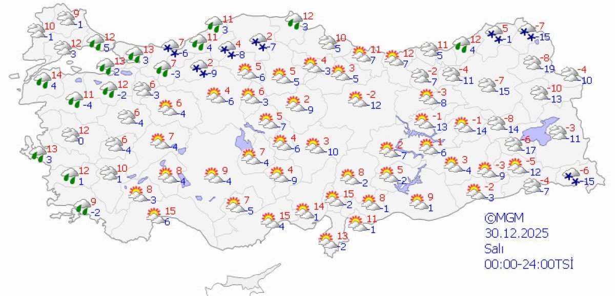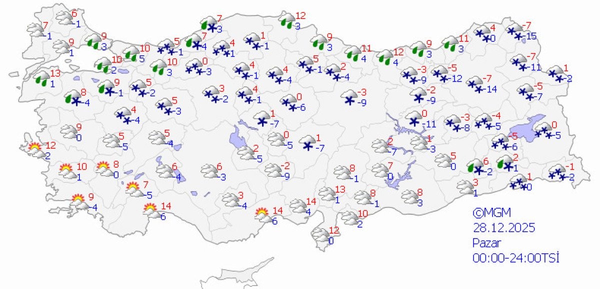 MGM’nin 5 günlük hava tahmin raporuna göre, 31 Aralık Çarşamba günü İç Anadolu, Doğu Anadolu ve Batı Karadeniz’in iç kesimlerinde yer alan 54 ilde kar yağışı bekleniyor.