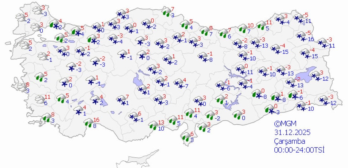 Meteoroloji Genel Müdürlüğü (MGM) verilerinden derlenen bilgilere göre, yurt genelinde sıcaklıkların mevsim normallerinin 5 ila 8 derece altında seyretmesi beklenirken, yılbaşı gecesi birçok ilde kar yağışı öngörülüyor.