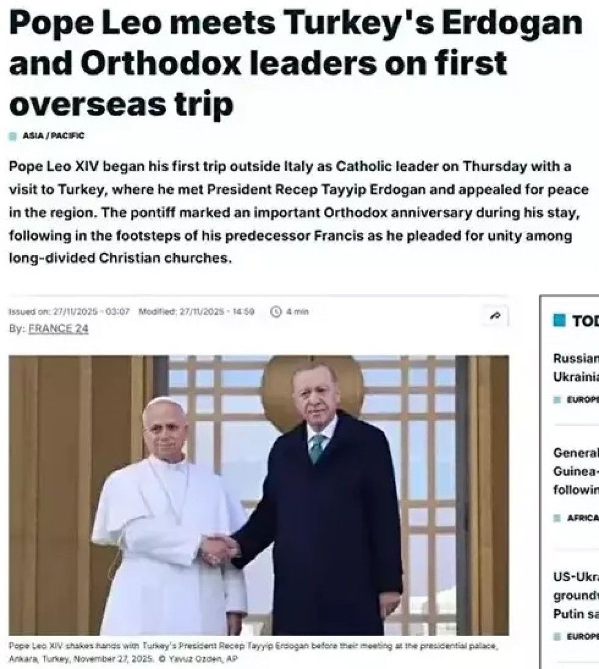 İlk yurt dışı ziyaretini Türkiye’ye yapan Papa 14. Leo’nun Cumhurbaşkanı Recep Tayyip Erdoğan’la görüşmesinin ardından yaptığı açıklamada Erdoğan’a ‘istikrar kaynağı’ olarak rol üstlenmesi çağrısında bulunması dünya basınında gündeme oturdu.