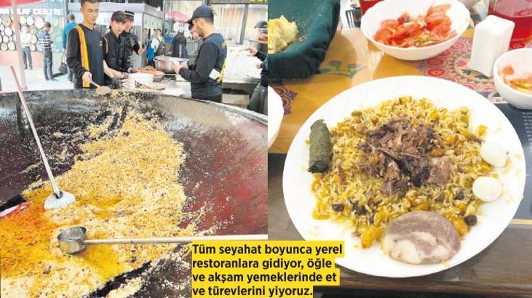 Öğle yemeği için kentin en turistik restoranı olan Beş Kazan’a gidiyoruz. Geleneksel Taşkent pilavı servis ediliyor. Bol üzümlü bir pilav tabağı, ortasında et, tabağın bir yanında iki bıldırcın yumurtası, diğer yanında tek bir sarma. Pilav fazla tatlı ama çok leziz. Tüm seyahat boyunca yerel restoranlara gidiyor, öğle ve akşam yemeklerinde et ve türevlerini yiyoruz. Ama elbette modern restoranlar ve tanıdık tatlar da var. Bizim yemek kültürümüz için fazla etli bir menü. Salataları çok güzel. İyi kalite yağlarla yapılıyor. Çorbalar enfes. Un aşı çorbasına bayıldım. İçinde ince kesilmiş erişte, birkaç küçük köfte ve nohut var. Çok hafif ve lezzetli. Ama benim favorim ‘hırçıl’ oldu. Patlıcanı mısır ununa bulayıp kızarttıktan sonra teriyaki sosla servis ediyorlar. Cennet taamı gibi.